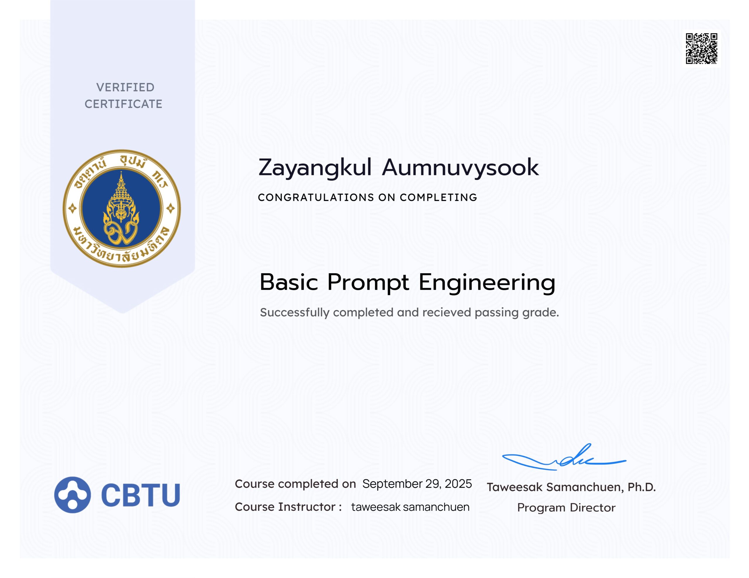CERTIFICATE Dhurakij Pundit University • From the college ChatGPT : Basic Prompt Engineering • CBTU : โครงการศูนย์ฝึกอบรมฐานสมรรถนะตามมาตรฐานอาชีพ กลุ่มสาขาวิชาเทคโนโลยีการจัดการระบบสารสนเทศ คณะวิศวกรรมศาสตร์ มหาวิทยาลัยมหิดล coursera : WordPress Certificate • Build Full Website WordPress Google Certificate • Google Saphan Digital • Google Adwords • Google Analytics coursera : META Certificate • Introduction Social Media Marketing Facebook Blueprint • Facebook Page • Facebook Ads • Facebook Pixel • Instagram Business LINE Certificate • Line Ads Professional • Line Study Room TikTok Certificate • TikTok Ads Academy • TikTok Business Thai-MOOC • Creative Marketing • Infographic Design Seminar • META Business SME Summit 2022Bangkok at Chao Phraya River • อบรมการใช้เครื่องมือ บริษัท GOOGLE (THAILAND) • บรรยายพิเศษงานกิจกรรมนักศึกษา หัวข้อการตลาดออนไลน์ (ม.กรุงเทพ) • เป็นตัวแทนบริษัท เข้าร่วมสัมมนา Business Marketing Expo 2016 Seminar • META Business SME Summit 2022Bangkok at Chao Phraya River • อบรมการใช้เครื่องมือ บริษัท GOOGLE (THAILAND) • บรรยายพิเศษงานกิจกรรมนักศึกษา หัวข้อการตลาดออนไลน์ (ม.กรุงเทพ) • เป็นตัวแทนบริษัท เข้าร่วมสัมมนา Business Marketing Expo 2016